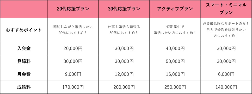 - 月会費・・・お見合い実施調整/定期面談実施(現状確認とご成婚までの目標の明確化と継続など)/お見合い/交際中のお悩み相談/システム管理費/情報管理費/システム利用費/婚活パーティー各種ご案内(参加費は別途) ※初月のみ初期費用と一緒にお支払いいただきます。